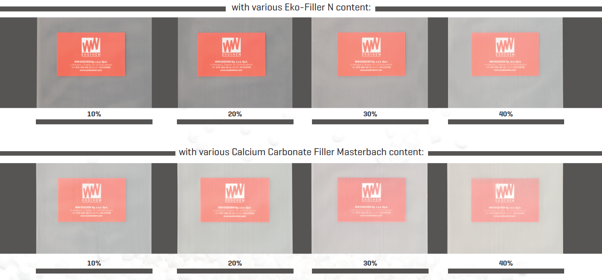 Verglichen mit Standard CaCO3 Füllstoffen, hat Eko-Filler N als transparenter Füllstoff, keinen Einfluss auf farbliche Veränderungen des finalen Produktes und erlaubt volle Transparenz.