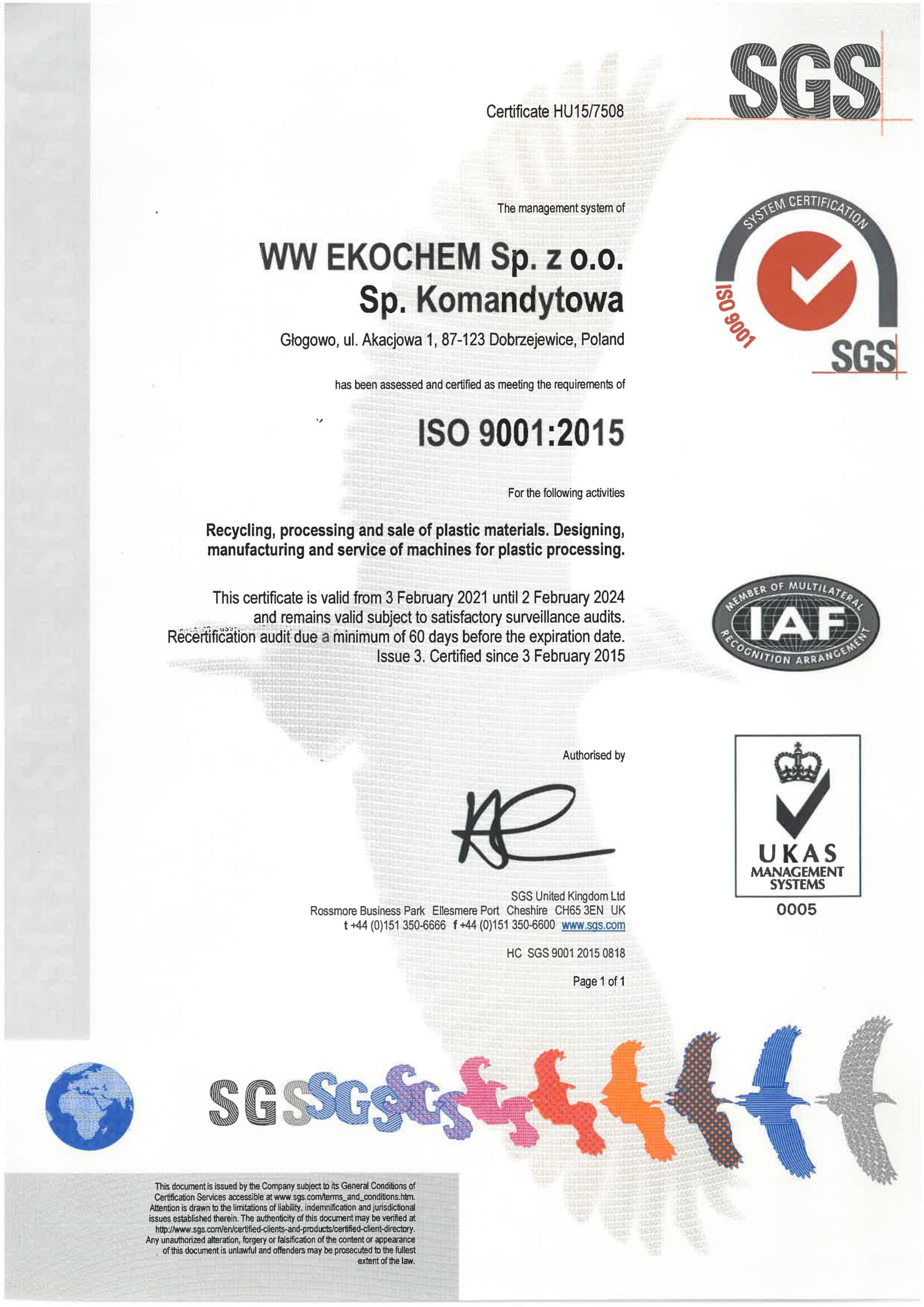 We are pleased to inform that based on the audit, SGS POLSKA Sp. z o. o. has confirmed that WW EKOCHEM meets the requirements of the ISO 9001:2015 standards in the field of "Recycling, processing and sales of plastics. Design, production and service of machines for plastics processing". The implemented Quality Management System in accordance with this standard helps us supervise the quality of production processes, optimize costs and increase our customers' satisfaction.