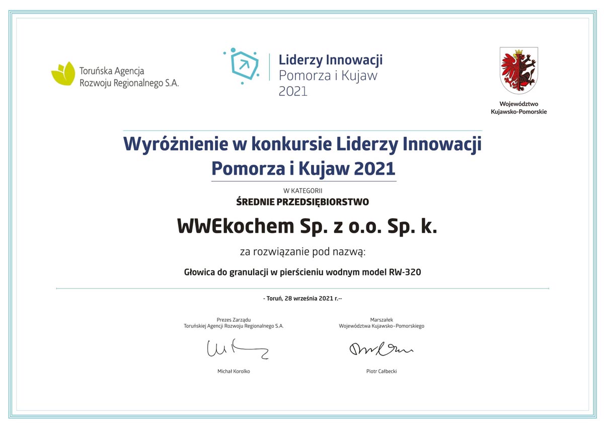 On September 28, 2020 in Copernicus Toruń Hotel, during the Final Gala of the Innovation Leaders of Pomerania and Kujawy 2021 competition, WWEkochem received a distinction in the Innovation Leaders of Pomerania and Kujawy 2021 competition in the medium-sized enterprise category for the solution called: "Water ring granulation head model RW-320".