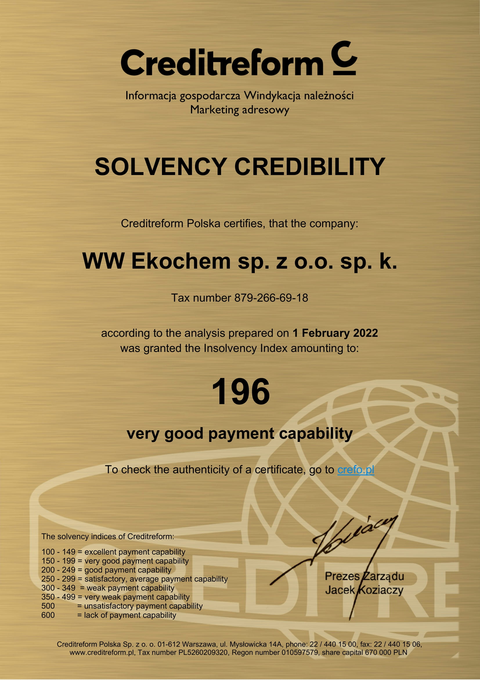 Creditreform, an international business intelligence agency, has positively assessed the payment credibility of WWEkochem Sp. z o.o. Sp. K. Our value of the payment ability index, as determined by Creditreform, allowed us to obtain the status of a very good payment ability.