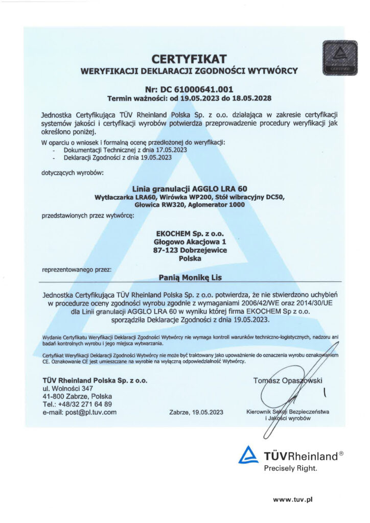 - Podwójny system stabilizacji temperatury w aglomeratorze, który składa się z dwóch dolnych natrysków wody wraz ze sprężonym powietrzem.
